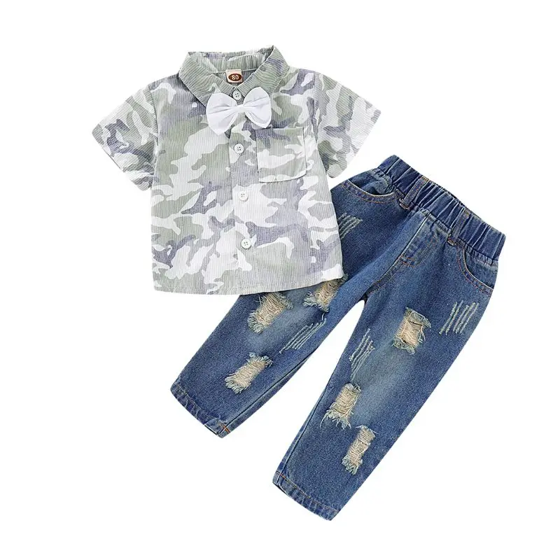 Special Chance of 2019 Summer Baby Boy Short Sleeve Camo Print Shirt Bow Tie Ripped Jeans 2PCS Infant Boys Clothes Se