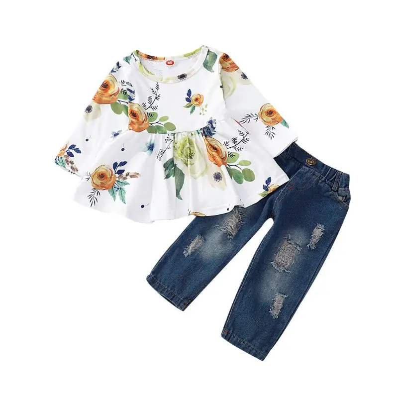 Cheap Price of Toddler Infant Baby Girls Floral Ruffle Tunic Tops+Ripped Denim Pants Jeans Baby Girl Clothes 1-4Y