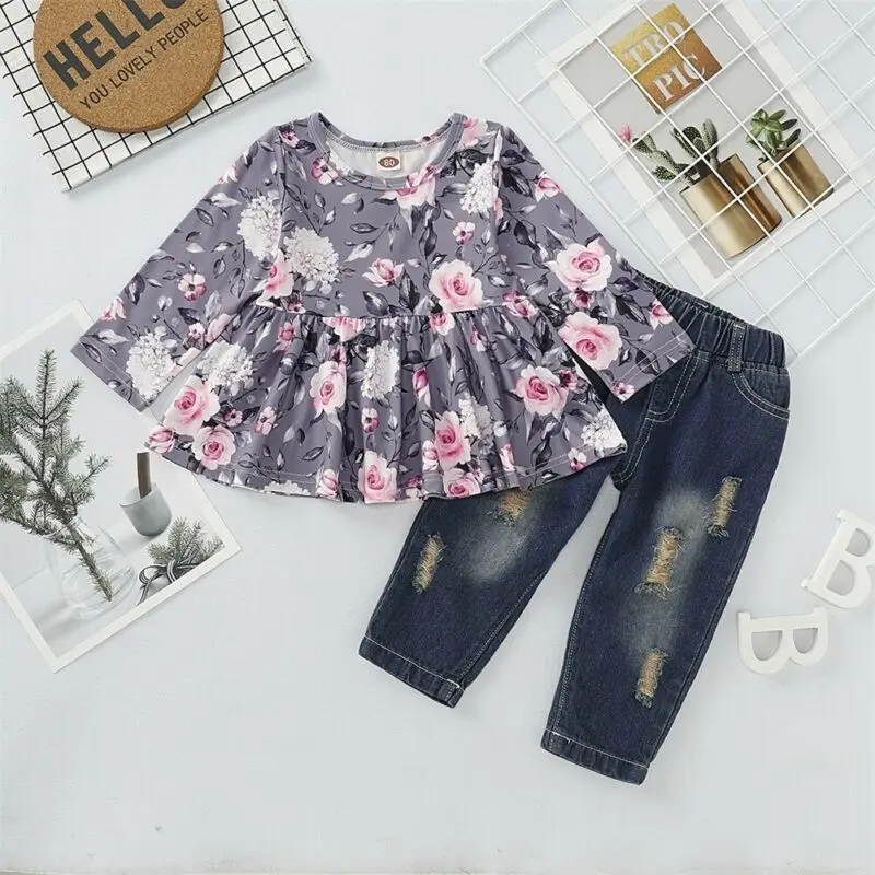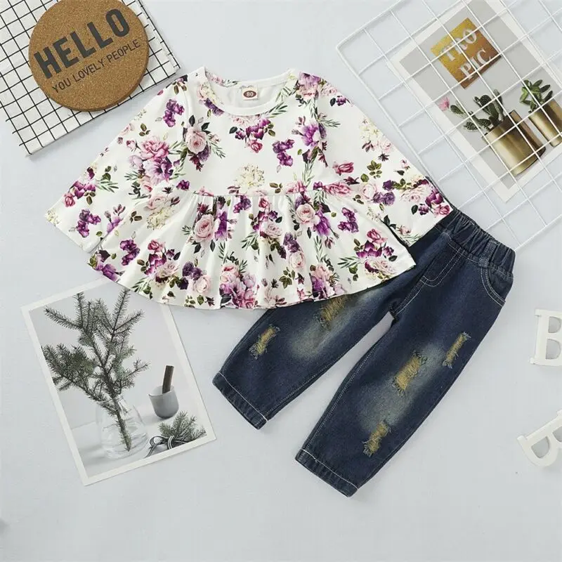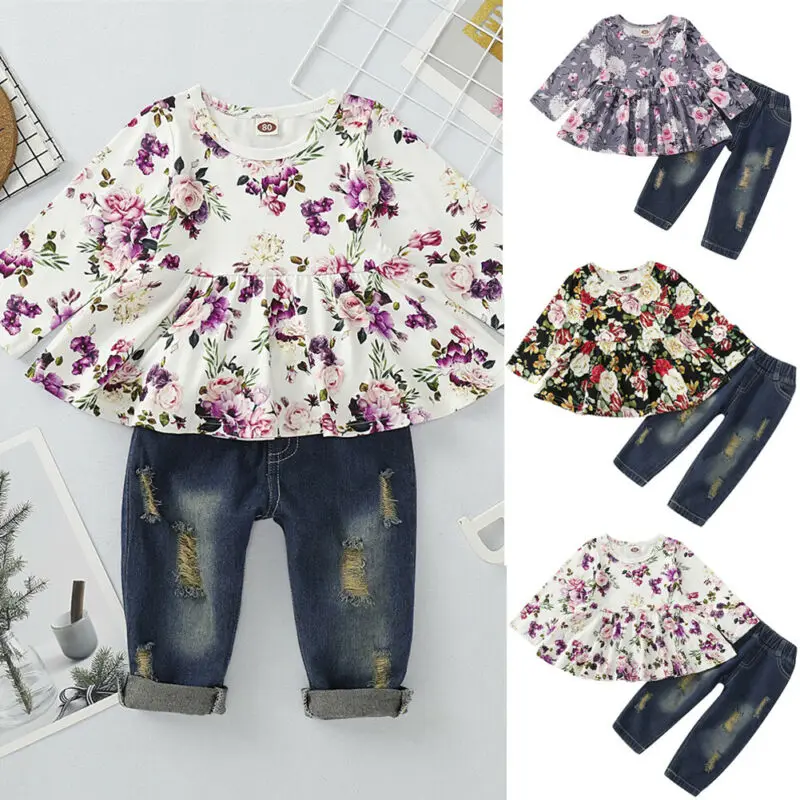 Cheap Offer for Toddler Kids Baby Girls Clothes Floral Tops Denim Pants Jeans Outfits Set 0-4 years
